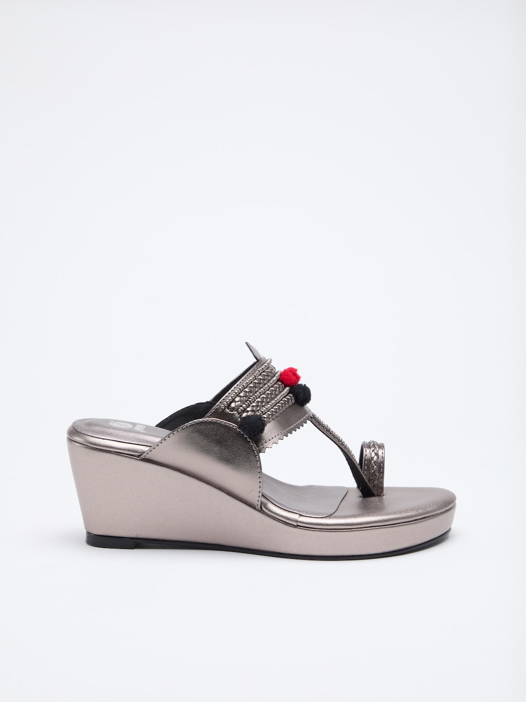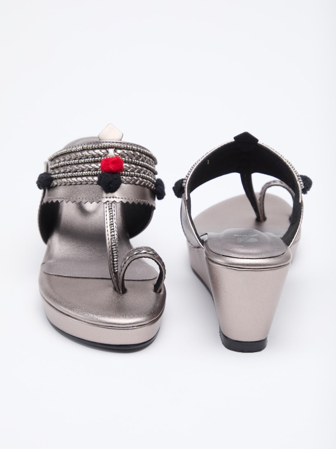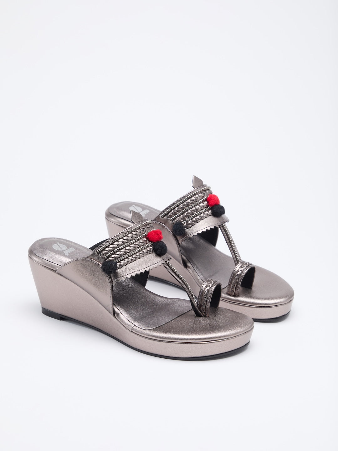 These Kolhapuri Wedges blend metallic tones with a classic platform base, finished with pom-pom accents that bring a festive, ethnic flair to every step.