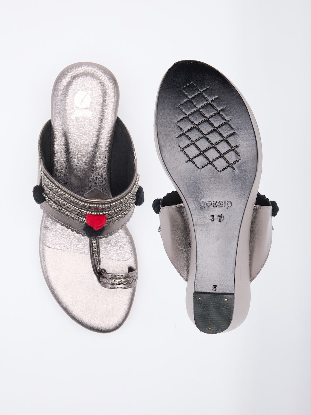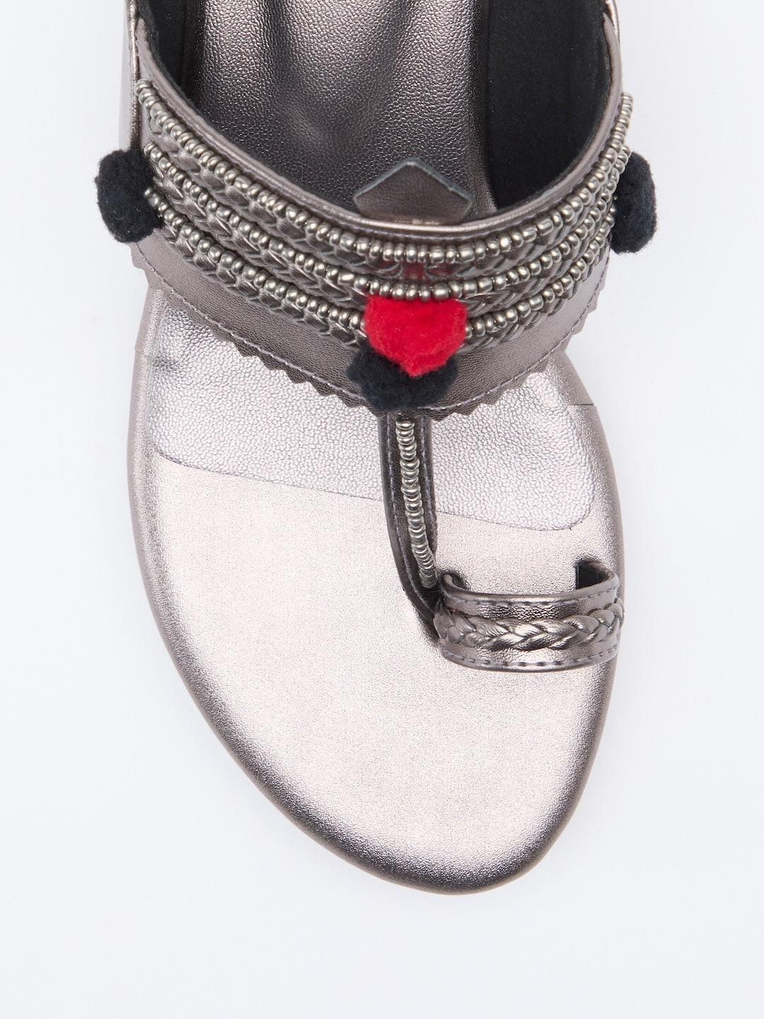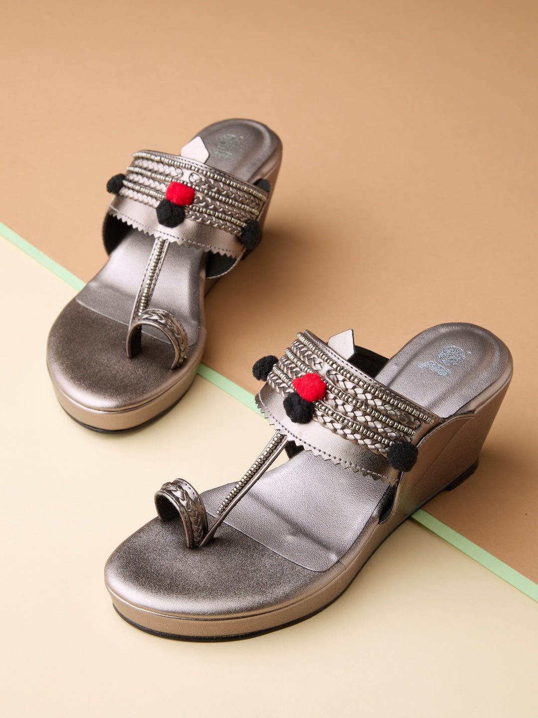 These Kolhapuri Wedges blend metallic tones with a classic platform base, finished with pom-pom accents that bring a festive, ethnic flair to every step.